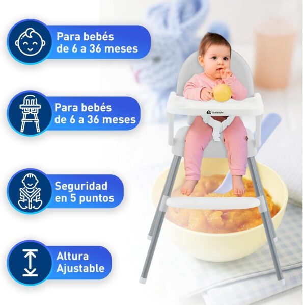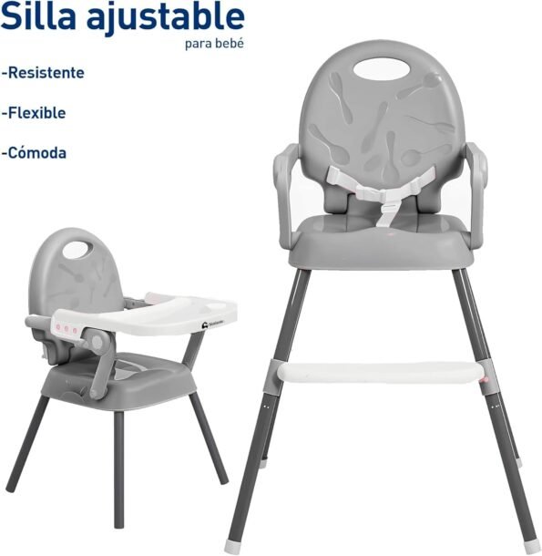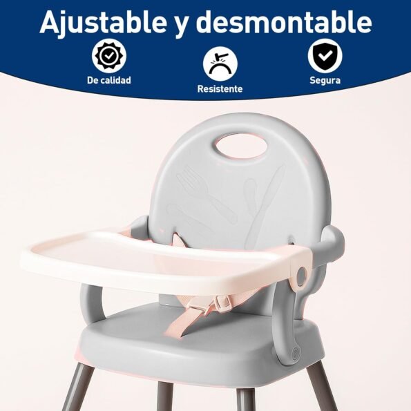 [CARACTERÍSTICAS ADICIONALES] Esta silla para bebé viene con gestos adicionales que mejoran su experiencia de uso, incluye broches de seguridad para asegurar al bebé correctamente, una charola desmontable para facilitar la limpieza, ajuste en la altura para adaptarse al crecimiento del bebé