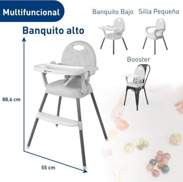 [MEDIDAS ADECUADAS] La silla 3 en 1 tiene dimensiones ideales para adaptarse al crecimiento del bebé, silla alta cuenta con las medidas de 90*55*48.5 cm, silla pequeña 63.5*41*36 cm, su asiento ergonómico tiene una medida de 39.5*38*31.5 cm, y la charola cuenta con las medidas de 34*38 cm la cual es ajustable a diferentes posiciones