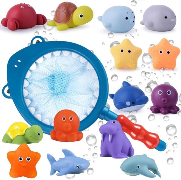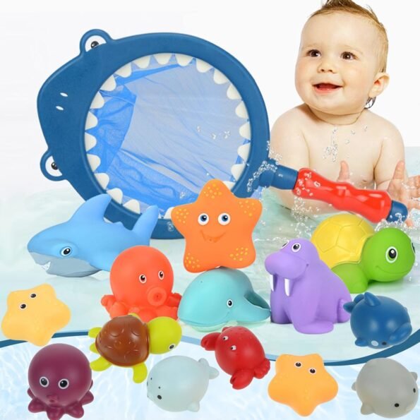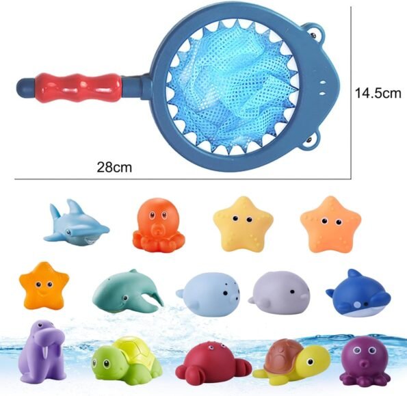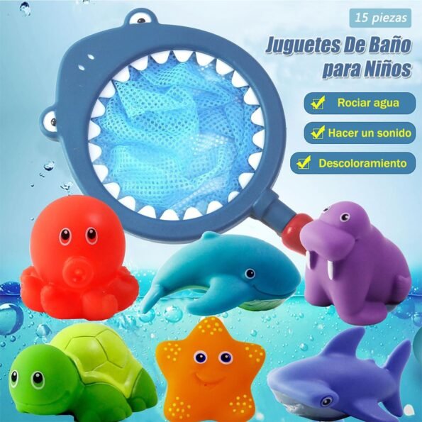 Incluye de 1 red de pesca + 14 juguetes de animales flotantes : animales marinos: tiburón, ballena, león marino, estrella de mar, pez payaso, pulpo, tortuga, cangrejo, etc.