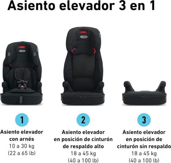 Crece con su hijo desde el arnés orientado hacia adelante (22-65 lb) hasta el refuerzo de espalda alta (40-100 lb*) y el refuerzo sin respaldo (40-100 lb) * Para continuar cumpliendo con los estándares de la industria, hemos aumentado el peso mínimo de 30 a 40 lb