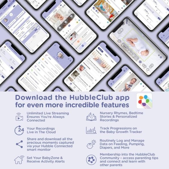 Vea la transmisión Wi-Fi en vivo y gestione todas las funciones con la unidad principal de visualización táctil a color diagonal de 5 pulgadas o a través de la aplicación HubbleClub en su dispositivo inteligente, proporcionando un cómodo acceso para monitorear a su bebé en cualquier momento y en cualquier lugar.