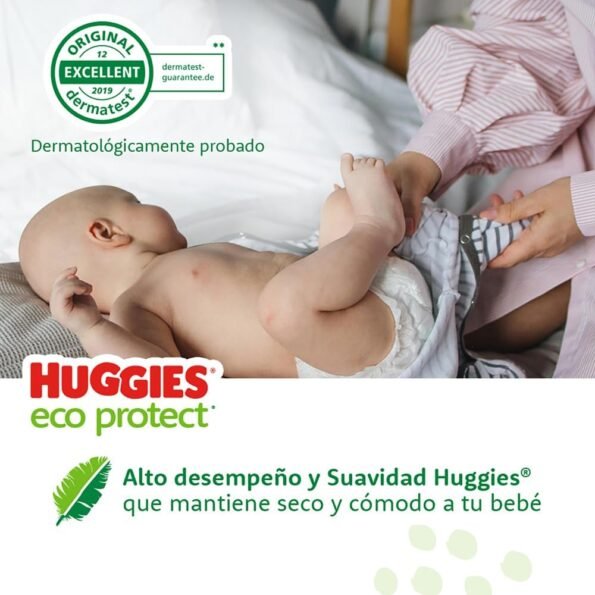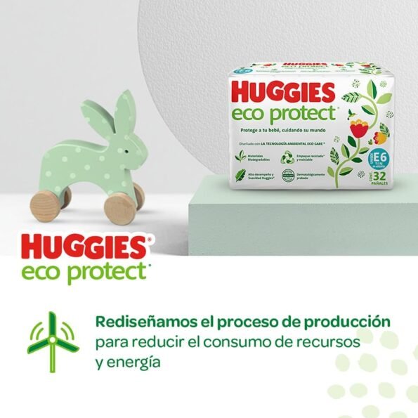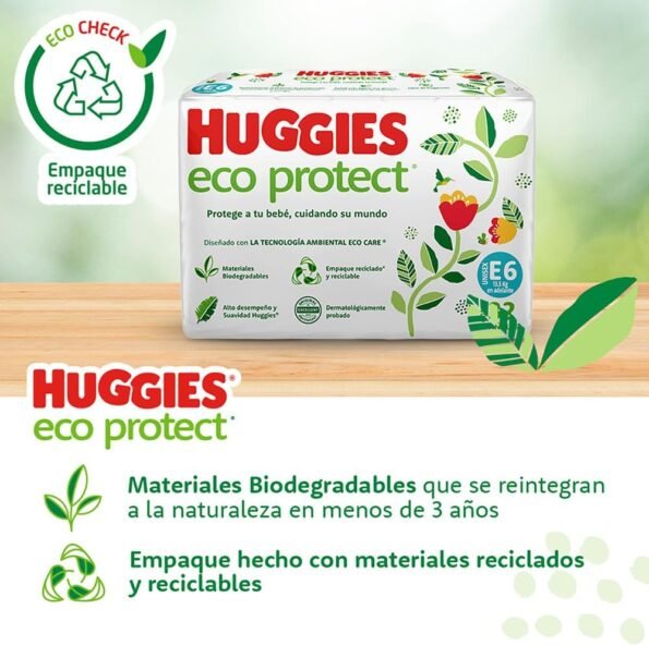 Huggies Eco Protect está diseñado con la tecnología ambiental Eco Care. -Pañal biodegradable que se reintegra a la naturaleza en menos de 3 años -Es el pañal más ligero por lo que genera un menor volumen de desecho -Empaque hecho con materiales reciclados y reciclables. -Alto desempeño y suavidad Huggies que mantiene seco y cómodo a tu bebé. -Dermatologicamente probado. -Rediseñamos el proceso de producción para reducir el consumo de recursos y energía
