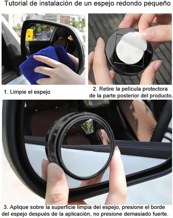 【Fácil de instalar】Antes de la instalación, es necesario limpiar el lugar donde tiene que instalar, después de la limpieza se ha completado, se puede sacar el producto, arrancar la pegatina adhesiva, y luego pegar el espejo de punto ciego en el lugar donde tiene que instalar, después de un cierto grado de presión para hacer el espejo de punto ciego instalado más firmemente, puede completar la instalación.