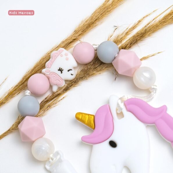 Color rosa con figuras de unicornio Fácil agarre Clip sujetador Silicona libre de BPA Múltiples texturas para aliviar la dentición y estimular el desarrollo sensorial Se puede hervir y congelar Es seguro para lavavajillas