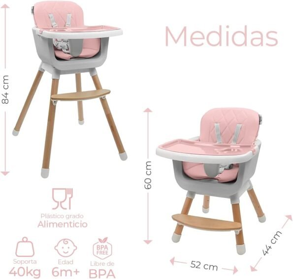 Puedes ajustar la silla en dos alturas diferentes, remover la charola para comida y desmontar el