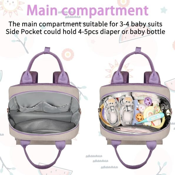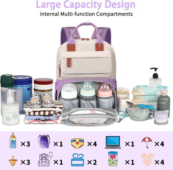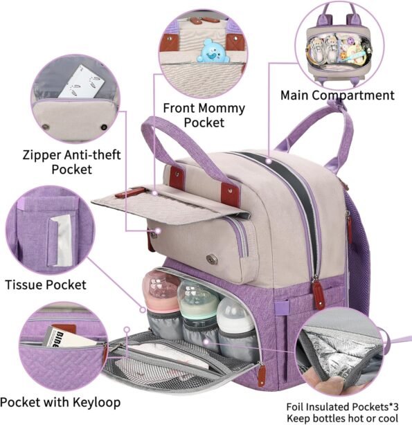 1 compartimento principal, 3 bolsillo aislado para biberón (adecuado para 5.8 pulgadas). 2 bolsillos exteriores para biberón o paraguas o toallitas2 organizadores de pañales, 3 bolsillos de malla, 1 bolsillo frontal separado seco y húmedo, 1 bolsillo para mamá1 bolsillo trasero antirrobo, 2 correas para carriola, 1 correa para equipaje