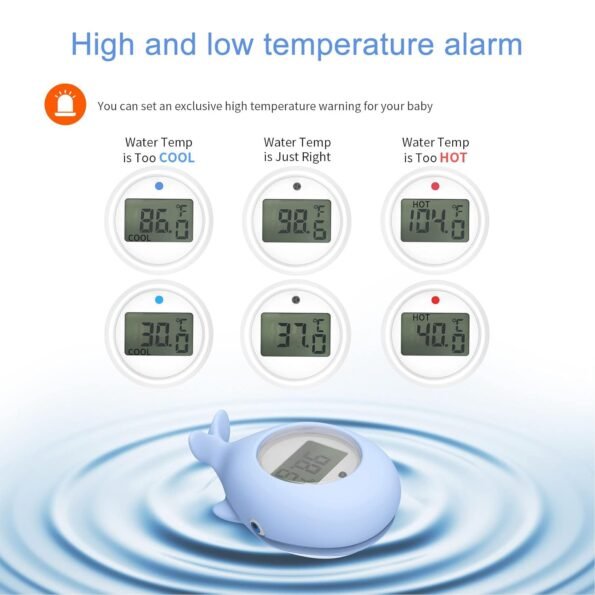 【Pantalla LCD】Nuestro termómetro digital cuenta con una pantalla LCD clara que muestra la temperatura del agua fácilmente. Cuando la temperatura supera un determinado rango, la pantalla indicará «frío» o «caliente» y parpadeará luces azules o rojas, garantizando que la temperatura del agua sea siempre adecuada y segura para tu pequeño.