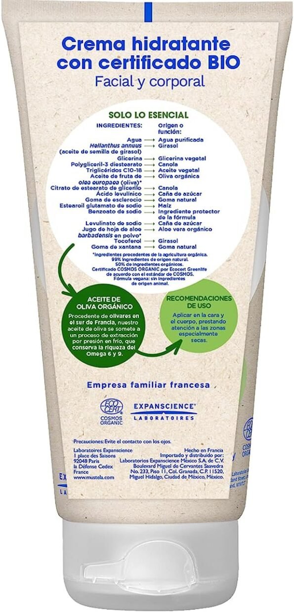 «Nuestra crema corporal y facial hidratante de Mustela está pensada para toda la familia, fue diseñada pensando en generar una piel suave, incluso para las más sensibles, formulada ecológicamente con activos naturales provenientes de cultivos orgánicos y agradables es para el uso diario, sin riesgo a irritaciones ni texturas pesadas o pegajosas. Hidrata la piel de forma duradera al 100% dejándola con una sensación suave de hasta el 96%, con notables resultados desde el primer día de uso. Mustela crema corporal y facial hidratante cuenta con alta eficacia clínicamente comprobada para toda la familia, incluso para recién nacidos, es libre de fragancia para evitar irritaciones o resequedad en la barrera de la piel. Mustela siempre tendrá como compromiso la seguridad, gracias a sus 60 años de investigación, Mustela desarrolla, con colaboración con profesionales de la salud, cuidados específicamente ideados para la piel de toda la familia, garantizando su seguridad desde el nacimiento. Añade ya mismo a tu carrito de compra esta Crema Corporal y Facial Hidratante Bio Orgánico de Mustela y comienza a cuidar hoy mismo de la salud en tu piel, te invitamos a descubrir todos los productos que en Mustela traemos para tu cuidado y el de tu familia. «
