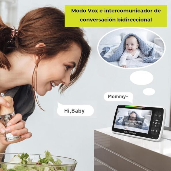 Principales características: Monitor de bebé de 5 pulgadas Modo VOX Cámara con control remoto de panorámica/inclinación/zoom Visión nocturna infrarroja invisible Comunicación bidireccional y 8 canciones de cuna Alarma de alimentación Monitoreo de temperatura