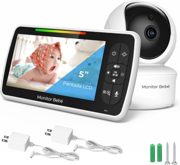 MXNUP Monitor Bebé 5 Pulgadas, Monitor para Bebe con Camara, Monitor de Video, Encriptación Digital, Visión Nocturna Infrarroja, Monitoreo de Temperatura, Comunicación Bidireccional, Canciones de Cuna