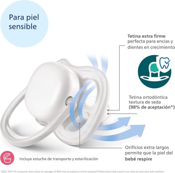 Aceptación de la tetina del 98 %*| Cuando preguntamos a las madres cómo respondían sus pequeños a nuestras suaves tetinas de silicona, una media del 98 % afirmó que su bebé aceptaba los chupones ultra soft y ultra air de Philips Avent.