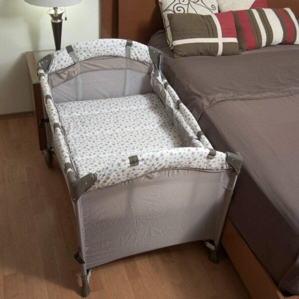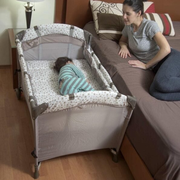 Cuenta con 2 niveles, el primero como cuna que cuenta con un barandal móvil que convierte la cuna a un práctico colecho con sujetadores de seguridad que se fijan a la base de la cama y el segundo como corral