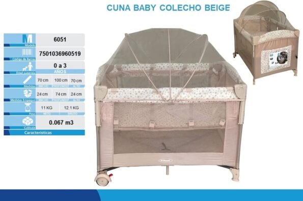 Baby Colecho beige. Todo lo que necesitas para el confort, seguridad de tu bebé y practicidad para ti. Cuenta con 2 niveles, el primero como cuna que cuenta con un barandal móvil que convierte la cuna a un práctico Colecho con sujetadores de seguridad que se fijan a la base de la cama y el segundo como corral. Con un sistema de cierre tipo sombrilla que te permite armarla en segundos. No requiere herramientas para su ensamble. Colchoneta acojinada para un suave descanso. Ruedas para un fácil manejo. Con una bolsa lateral donde podrás guardar los accesorios de tu bebé. Con mosquitero y bolsa que facilita su manejo y transportación. Todo para la llegada de esa personita tan especial. Edad recomendada de 0 a 3 años.