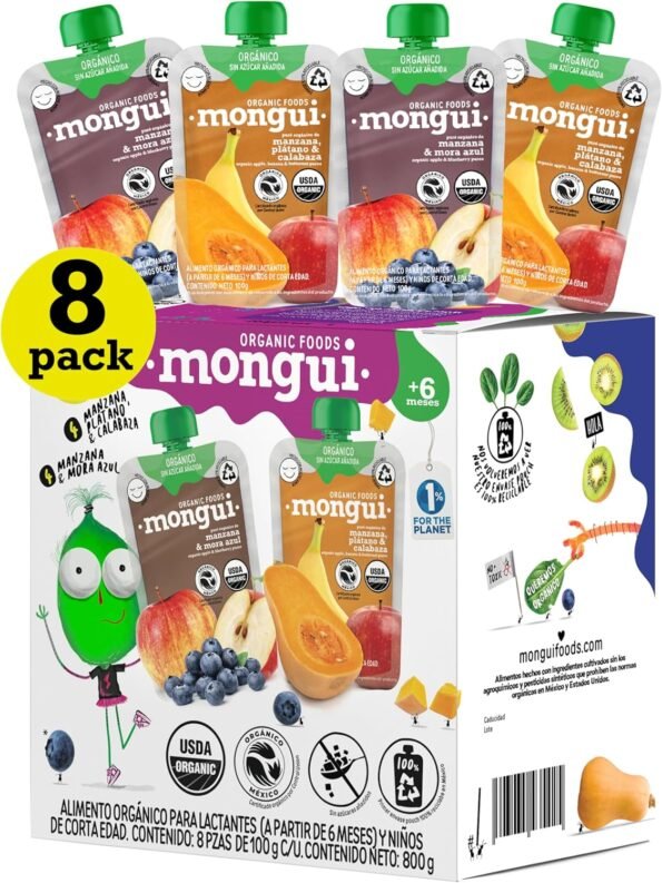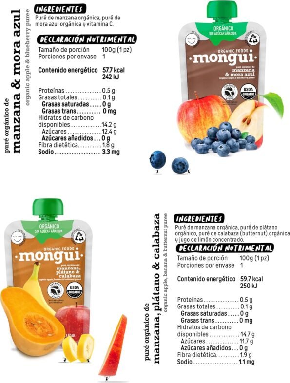 Añadir una reseña “Puré Natural Papilla Orgánica para Bebé | Snacks Saludables Sin Azúcar Añadida | BPA Free | MONGUI (8 Pack, Manzana Mora Azul – Manzana Platano Calabaza)”