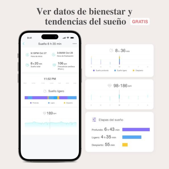 ANÁLISIS DETALLADO DEL SUEÑO: Conoce cómo duerme tu bebé con reportes detallados de sus ciclos de sueño. Observa si está en sueño profundo o ligero, mide la eficiencia del sueño y detecta despertares y siestas.
