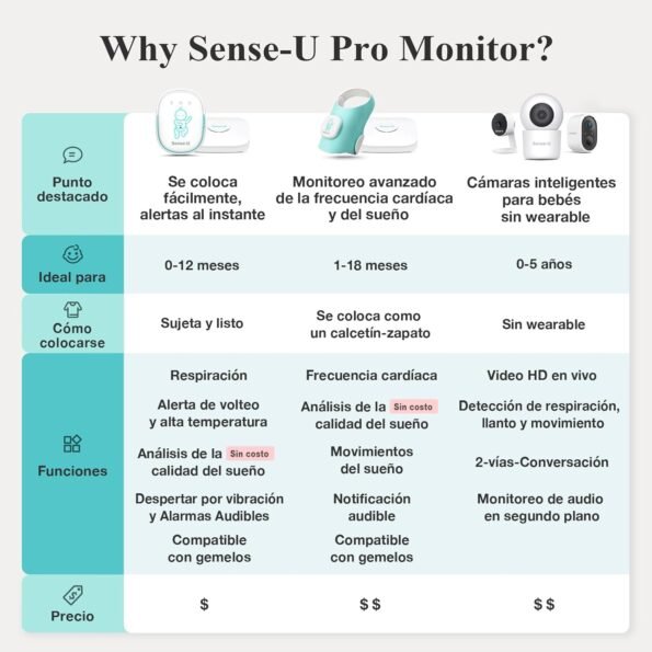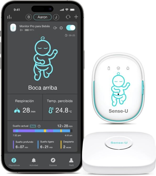Sense-U Monitor para Bebés Pro (Larga Distancia): Monitorea respiración, volteo, posición al Dormir y Temperatura, con vibración, alertas sonoras, notificaciones en la App y análisis del sueño