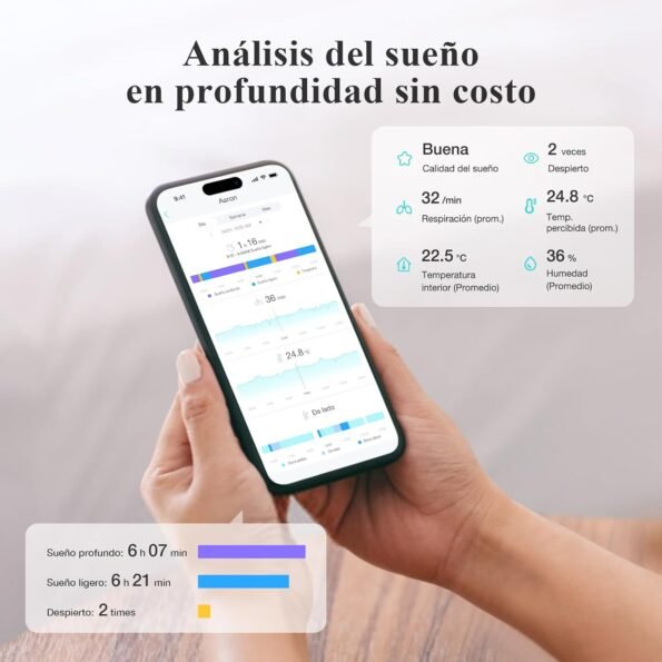 MONITOREO DE TEMPERATURA/HUMEDAD Y ANÁLISIS DE SUEÑO GRATIS: La estación base alerta cuando los niveles alcanzan valores predefinidos. Obtén reportes detallados de ciclos de sueño con fases profundas y ligeras, tiempos despierto y calidad general, brindando tranquilidad y mejores noches.