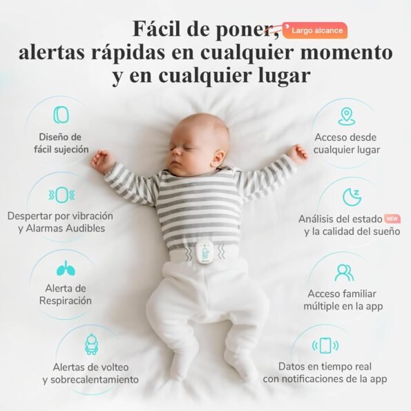 Con vibración, alertas audibles y en app para respiración, vuelco y sobrecalentamiento.