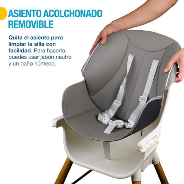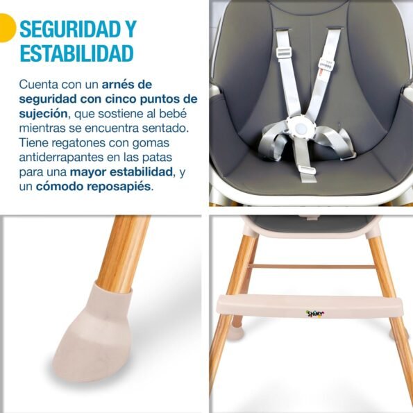SEGURIDAD Y ESTABILIDAD: Esta silla alta cuenta con un arnés de seguridad con cinco puntos de sujeción, que sostiene al bebé mientras se encuentra sentado. Asimismo, su estructura es muy estable, tiene regatones con gomas antiderrapantes en las patas para garantizar una mayor estabilidad, y un cómodo reposapiés