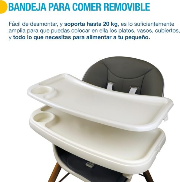BANDEJA PARA COMER REMOVIBLE PARA LIMPIAR FÁCILMENTE: Cuenta con una bandeja desmontable que soporta hasta 20 kg, y es lo suficientemente amplia para que puedas colocar en ella los platos, vasos, cubiertos, y todo lo que necesitas para alimentar a tu pequeño