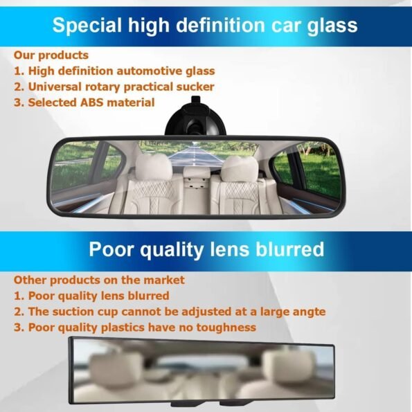 1. Espejo Retrovisor HD: Construido con fibra de vidrio de alta calidad, filtra la luz solar y mejora la visibilidad al reducir los deslumbramientos tanto de día como de noche.
