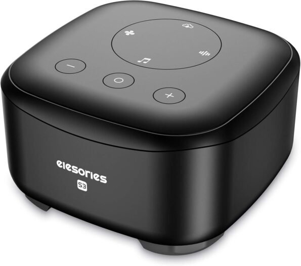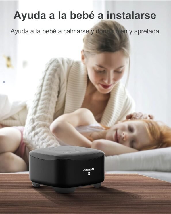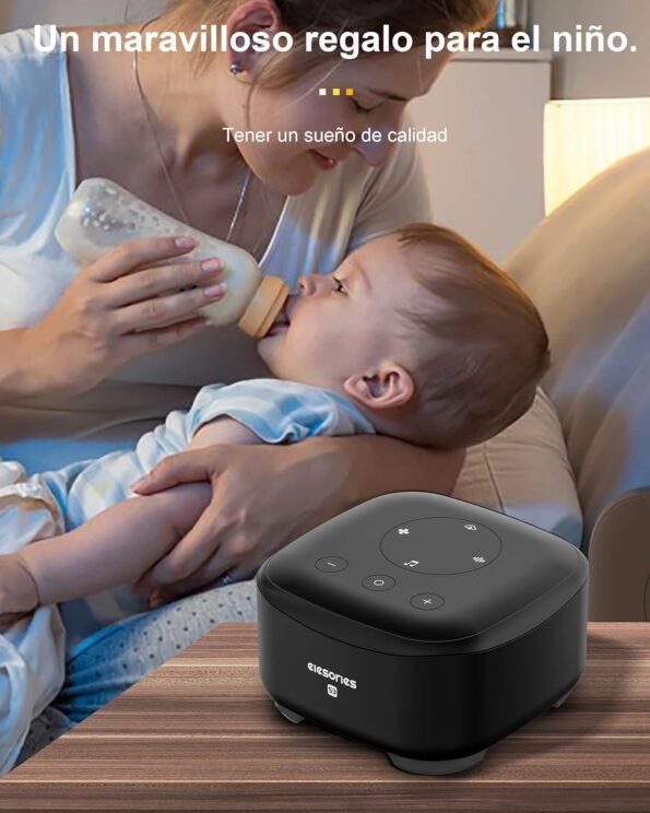 Encienda la máquina de ruido elesories S3-ECO, los sonidos relajantes como el ruido marrón, la canción de cuna, los pájaros del bosque, etc. le darán al bebé una sensación de seguridad y crearán una atmósfera somnolienta para ayudar al bebé a calmarse y dormir bien y apretado.