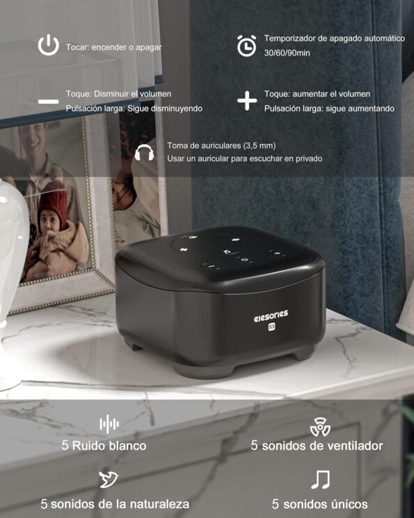 Conecta tus auriculares y disfruta de una experiencia de sueño exclusiva: Este «ruido blanco» cuenta con un conector de auriculares de 3.5 mm, lo que te permite crear un entorno de sueño personalizado. Usar auriculares te sumerge aún más, haciendo que la experiencia sea más realista