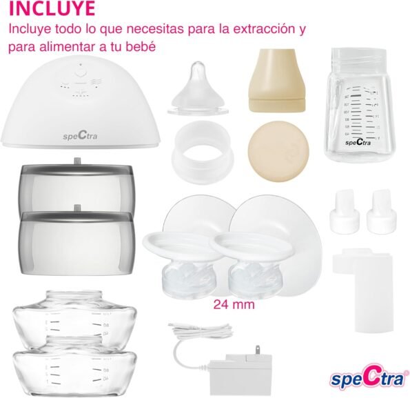 KIT COMPLETO PARA EXTRACCIÓN MANOS LIBRES | LIBRE DE BPA. Incluye todo lo necesario para extracción y alimentación práctica y confiable: 1 motor Wearable, 1 biberón de tetina peristáltica, 1 cargador, 2 sets de botellas Wearable, cada uno con: copa (brida) 24 mm, membrana de silicón y válvula silicón. Los accesorios en contacto con la leche materna son libres de BPA, garantizando una lactancia materna higiénica y segura para ti y tu bebé. Producto confiable Spectra, pensado para la maternidad.