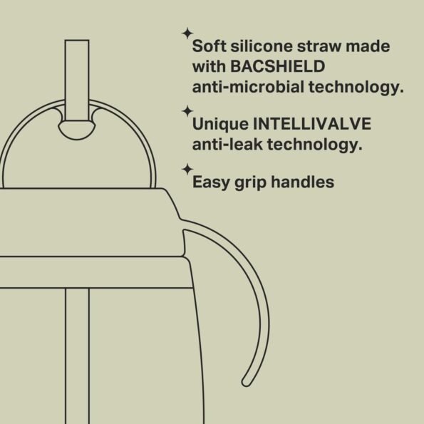 Los vasos con popote son una buena alternativa a las tazas para sorber, con un popote blando que ayuda a desarrollar la capacidad de sorber. El suave popote de silicona es fácil de usar y los más pequeños no tienen que inclinar mucho el vaso para beber. El popote con contrapeso permite al bebé beber desde cualquier ángulo y las asas de fácil agarre son perfectas para sus manitas. Diseñado para su uso a partir de los 6 meses, este resistente vaso para sorber permite a su bebé pasar sin problemas del biberón al vaso. Con INTELLIVALVE, una exclusiva tecnología antifugas que garantiza que este vaso con contrapeso y popote sea totalmente a prueba de derrames, ya que soporta la presión interna, lo que significa que el vaso no se derramará aunque se ponga boca abajo o se agite. Nuestra exclusiva válvula sella y regula el flujo de líquido para evitar fugas y facilitar el consumo. Con la higiene en la mente de todos, nuestras botellas para beber añaden una capa extra de seguridad, ya que la boquilla para beber contiene la tecnología antibacteriana BACSHIELD. BACSHIELD es una tecnología de iones de plata de uso común que proporciona protección antibacteriana a los productos contra bacterias no deseadas, reconocida desde hace siglos sin efectos nocivos. Actúa impidiendo la proliferación de microbios no deseados que pueden causar la degradación del producto, decoloración, manchas u olores. Esto se consigue con iones de plata mezclados en el material del popote (Las pruebas de laboratorios independientes demostraron una reducción del 99.9 % de las bacterias al cabo de 24 horas), que impiden que los microbios se multipliquen. Todos nuestros productos están libres de BPA, BPS, PVC, ftalatos y nitrosaminas.