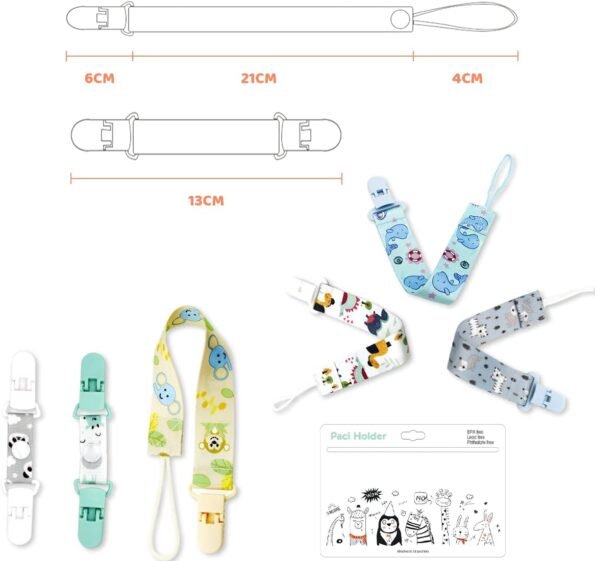 Alta Calidad y Resistencia: el clip y la correa del chupete están hechos de tela lavable y de alta calidad y plástico PP, seguro e inofensivo para los niños. Los clips son resistentes y podrían durar mucho
