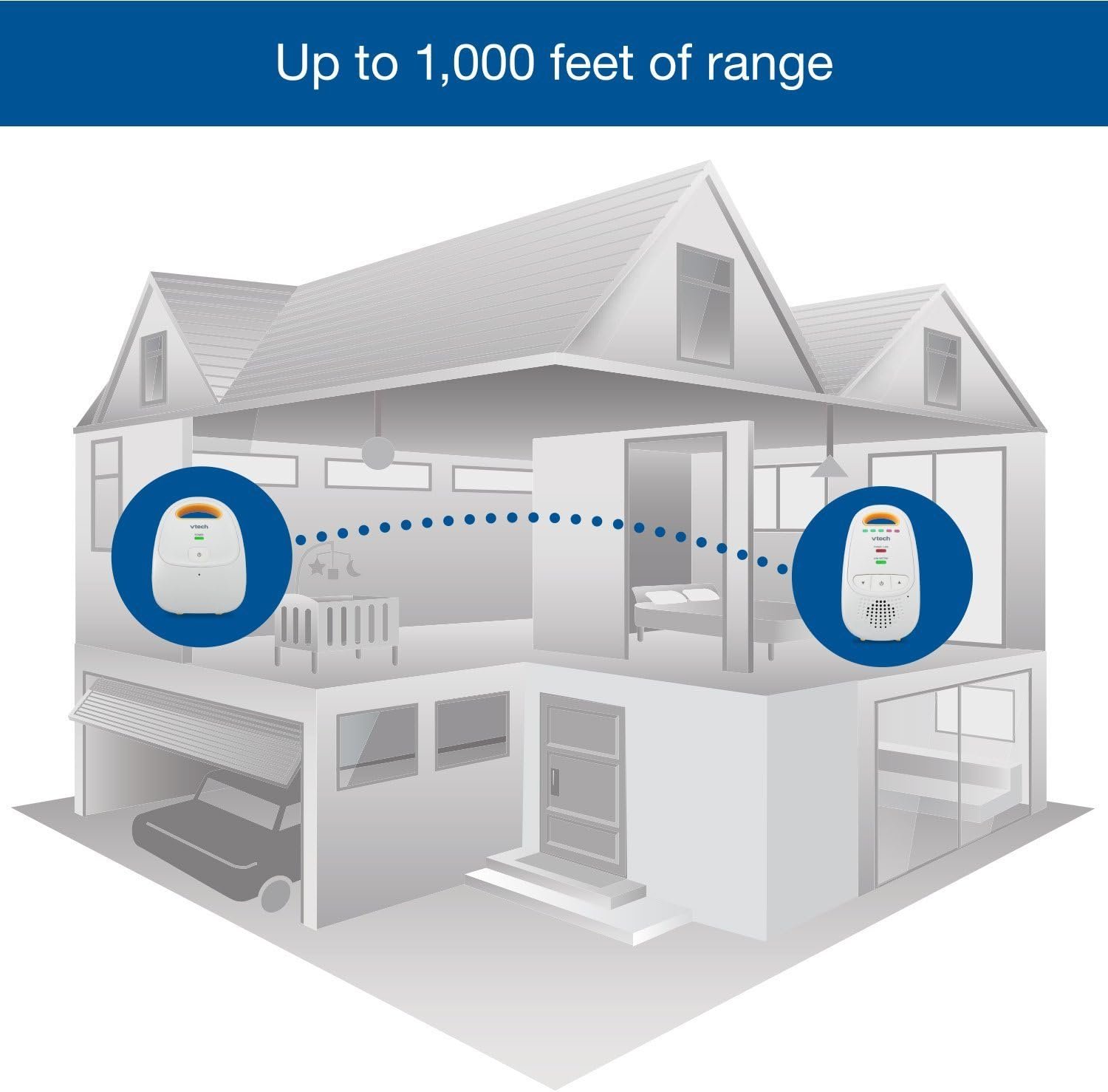 ** Gran alcance de la clase** El monitor para bebés con audio VTech DM111 tiene un rango de funcionamiento prolongado y confiable que cubre hasta 1,000 pies, le permite continuar el día y conectarse con su bebé desde otra habitación o incluso desde el patio ** Batería recargable mejorada* La unidad para padres incluye una batería recargable incorporada que admite hasta 8 horas de funcionamiento portátil.